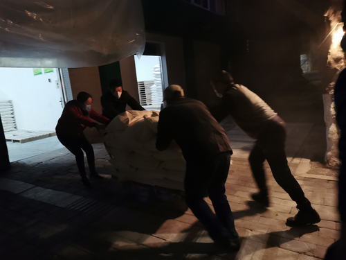 23点,运输车准时到达,该支部党员同志们立刻对整个车身、地面、司机和全体人员进行了消毒,然后迅速投入到搬运当中,大家干劲十足,形成了“领导带头干、员工主动干、上下联动保供应”的合力应战状态。全体党员干部经过5个小时的艰苦奋战,终于在凌晨4点将60吨军供面粉安全、整齐地堆码到军粮仓库。
