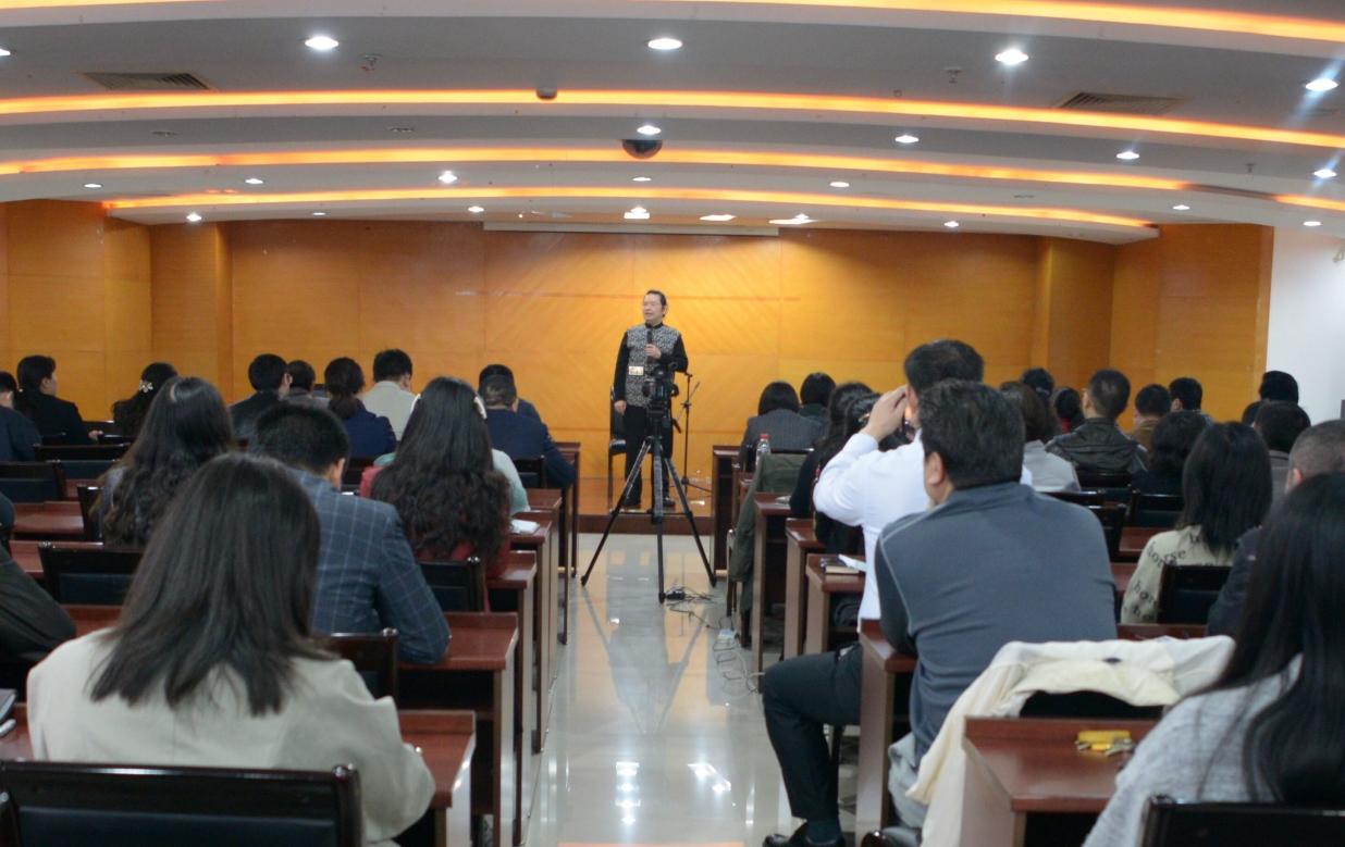 在寓庄于谐、情理交融的讲析之中,刘光宇院长采用边演边讲的独特形式,以其形神兼备的演奏技巧与诙谐风趣的语言动作,将六首著名的二胡名乐行云流水般地演奏出来,馈以在场干部职工,鲜活地展示出二胡艺术源远流长的文化底蕴,灵动地演绎出民乐二胡的非凡艺术魅力。