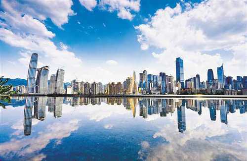 九月十一日,倒映水中的蓝天白云和渝中半岛。特约摄影 钟志兵